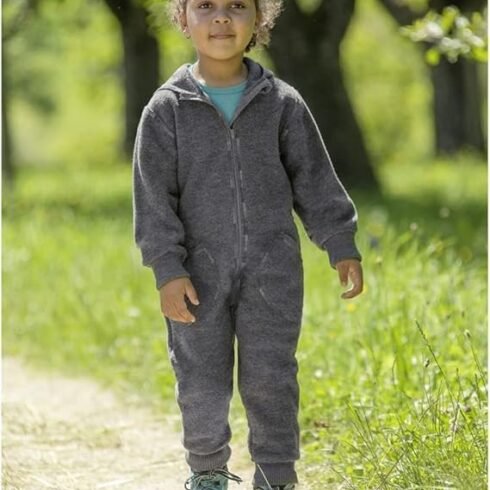 Overall Engel cu fermoar și glugă, 100% lână fiartă, gri-lavă