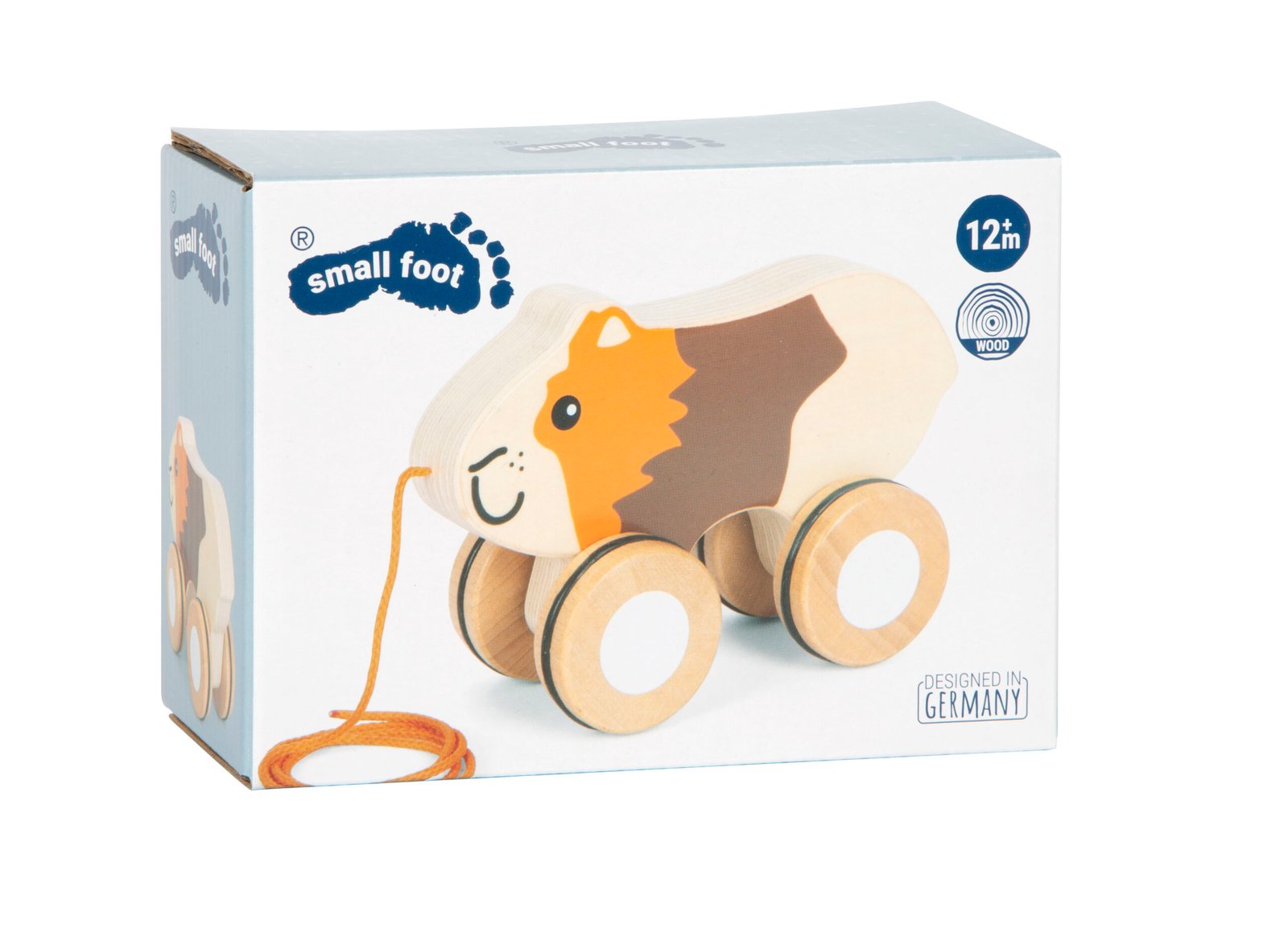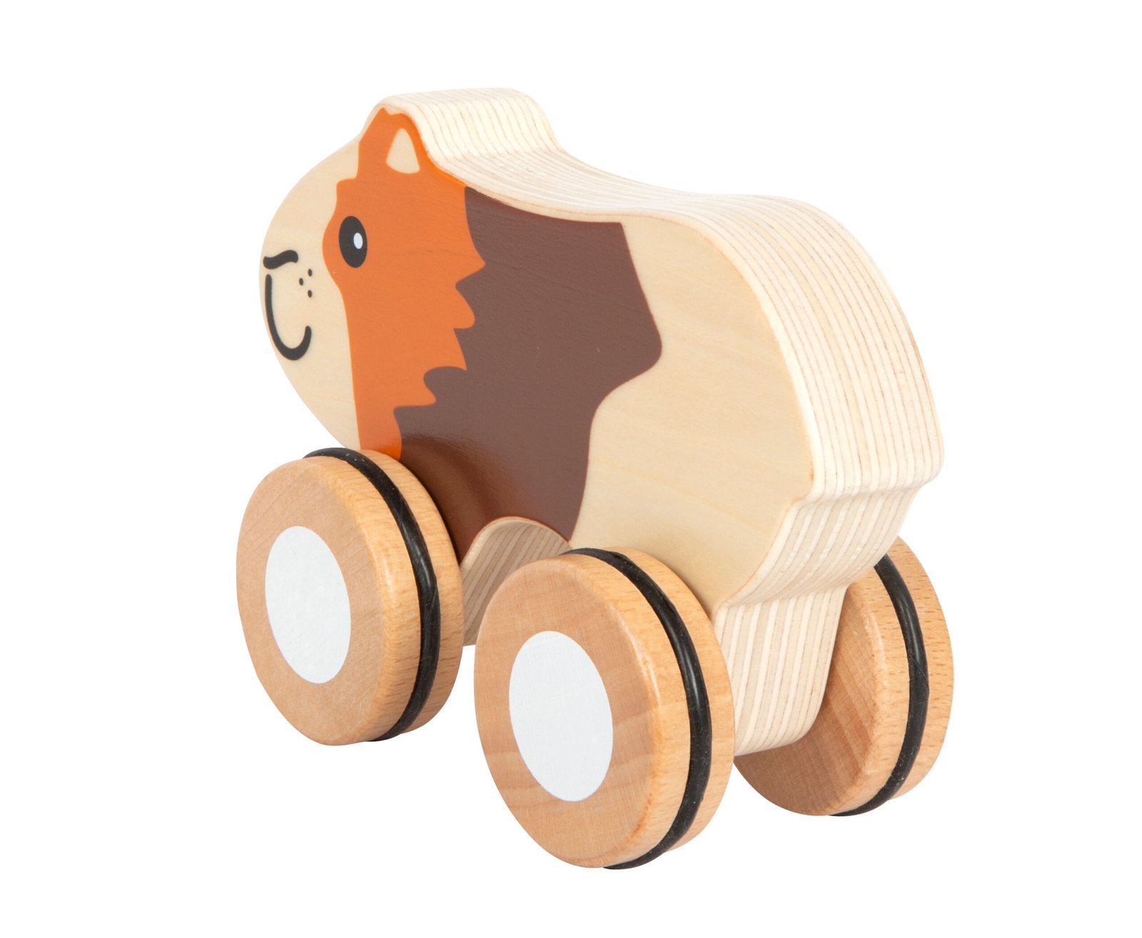 Atenție, iată un animal de companie pentru cei mici! Drăgălașul porcușor de Guineea, fabricat din lemn de înaltă calitate, încurajează copiii să aibe primele încercări de târâre și mers, ca jucăria de tragere sau împingere. Roțile cauciucate permit premergătorului să se miște înainte în liniște și fără a deteriora podeaua – un prieten de nădejde pentru micii exploratori!